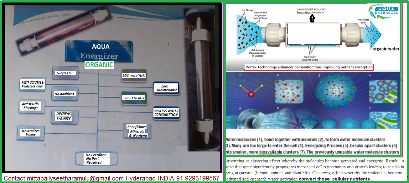 AQUA ENERGIZER for sustainable agriculture water converter without use of Fertilizer & Pest. Resulting farm yield more by 30-50%